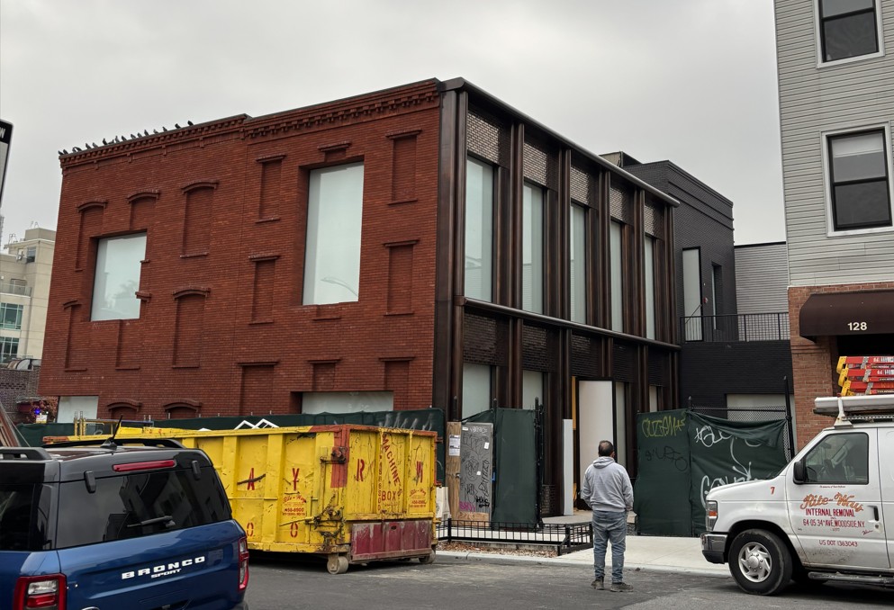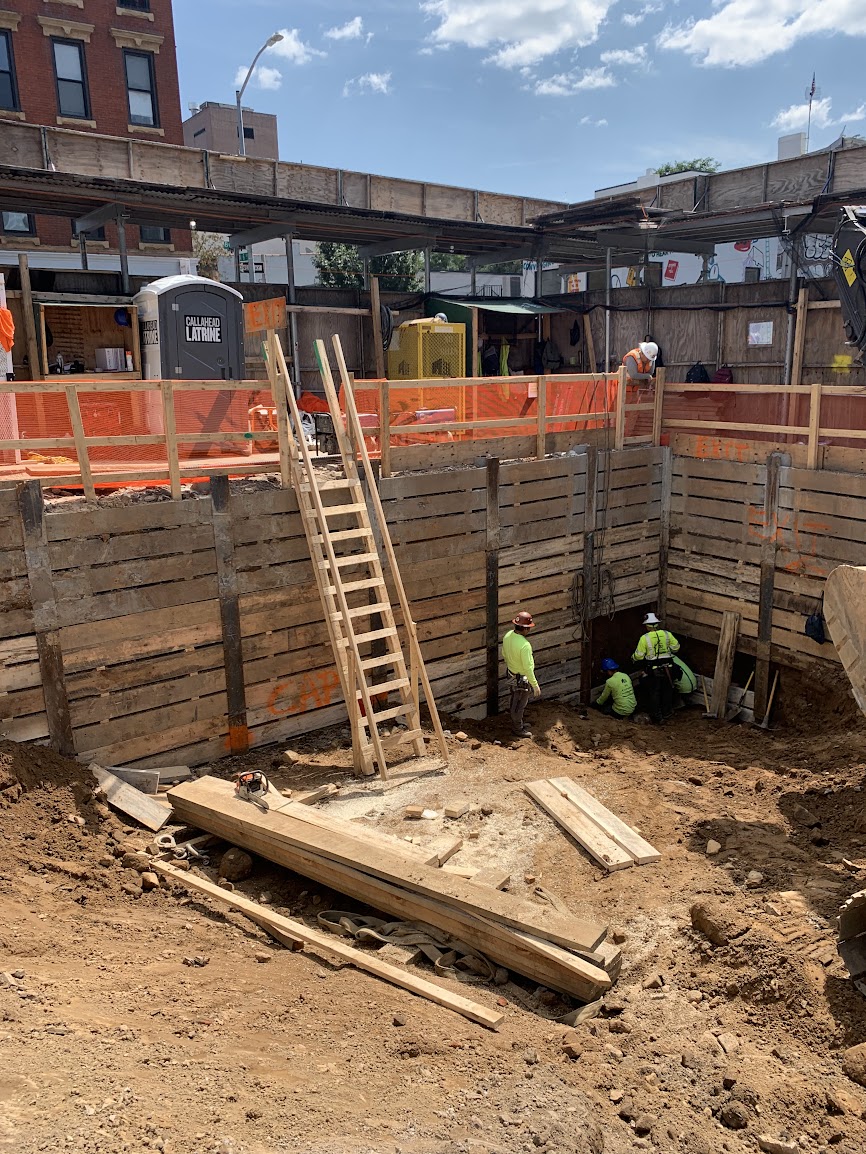 A new two-story building with a cellar was constructed in Williamsburg, Brooklyn, New York. The building is used as a retail space, and also includes a rear courtyard. The new steel-framed building partially sits above an existing masonry foundation on two sides, and required a new foundation, underpinning, and support of excavation to construct the rest of the foundation. The support of excavation involved the temporary installation of grouted steel piles along the South and East, street-adjacent, sides of the building, and along the West edge of the building that abutted the adjacent property. The West edge of the building also involved inject-grouting of the existing soil to help support a new elevator pit.