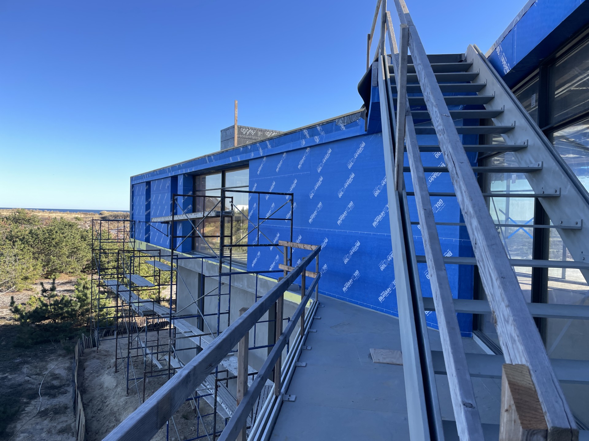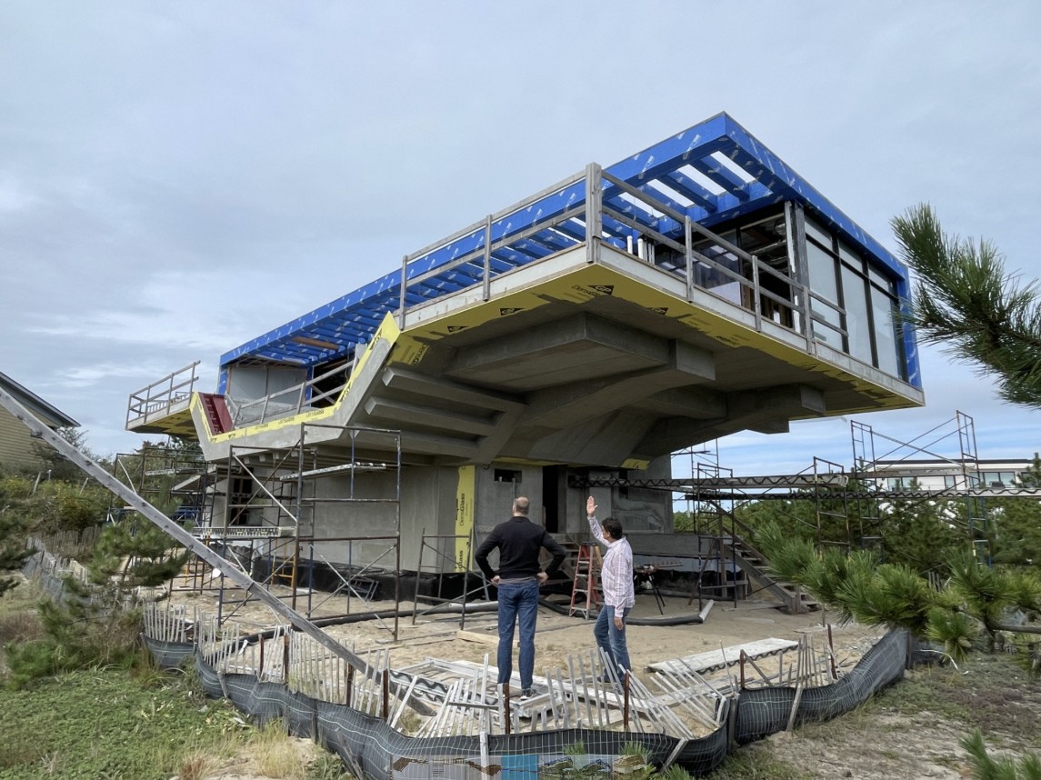 A radical residential design on the ocean in Montauk consisting of a reinforced concrete 2nd floor and conventional steel framing for the roof. Each end of the building cantilevers out over the 1st floor structure (including the pool!) to limit the disturbance to the protected lands surrounding the house.