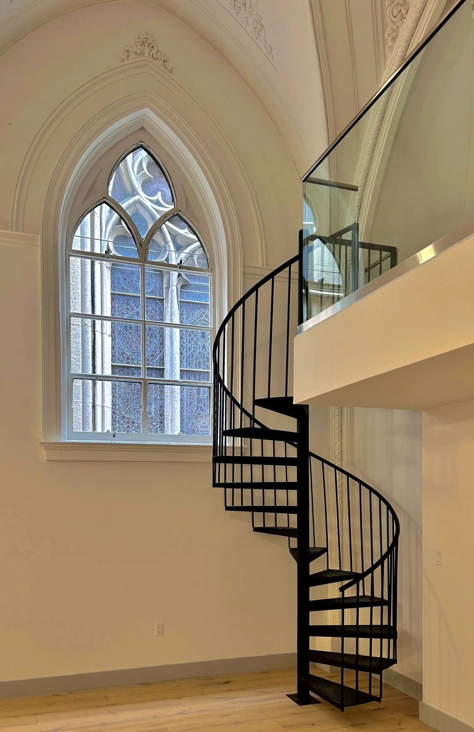 A new steel-framed mezzanine level was installed below the existing church apse for a new bedroom. Miscellaneous openings throughout the space were also infilled to accommodate additional floor space.
